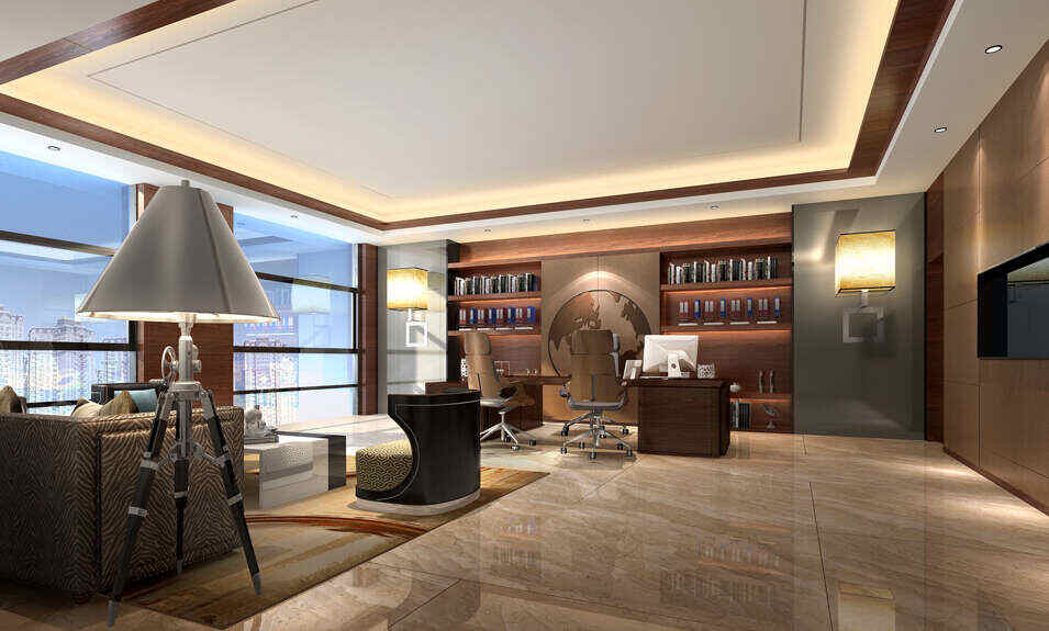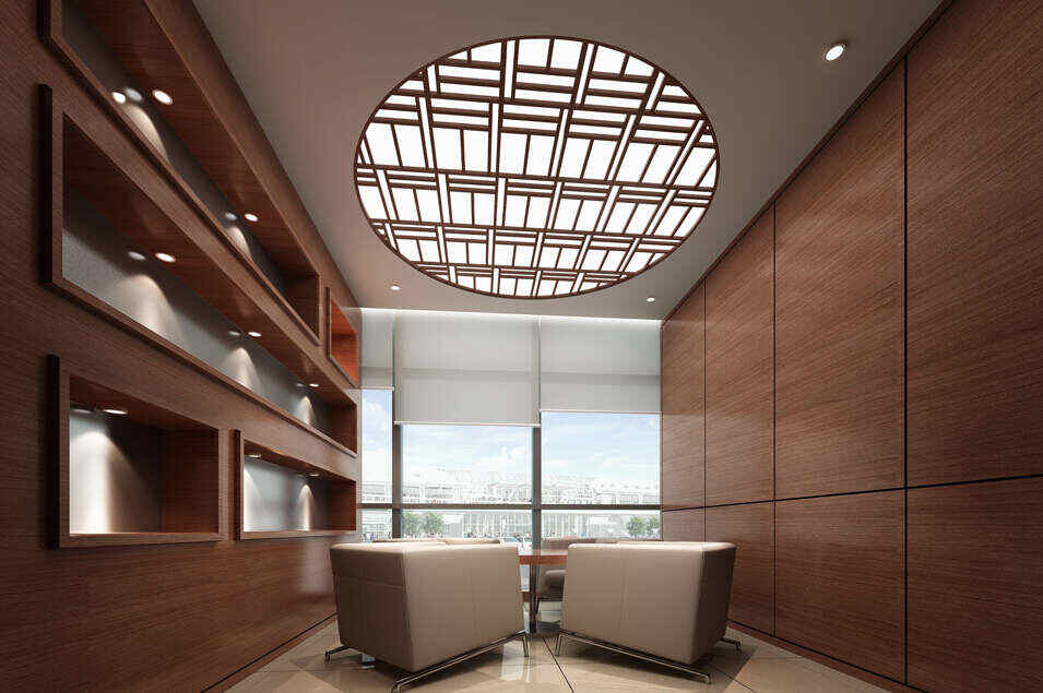 設(shè)計(jì)介紹:現(xiàn)代簡(jiǎn)約凝重風(fēng)如何展現(xiàn)?設(shè)計(jì)師們運(yùn)用棕色的色調(diào)表現(xiàn)出凝重感,頂部圓形中國(guó)風(fēng)網(wǎng)狀帶有悠久的中國(guó)藝術(shù),天圓地方設(shè)計(jì),使人一進(jìn)入到這個(gè)辦公室給人與專業(yè)、理性的感覺(jué),這點(diǎn)特別符合公司的企業(yè)文化。
