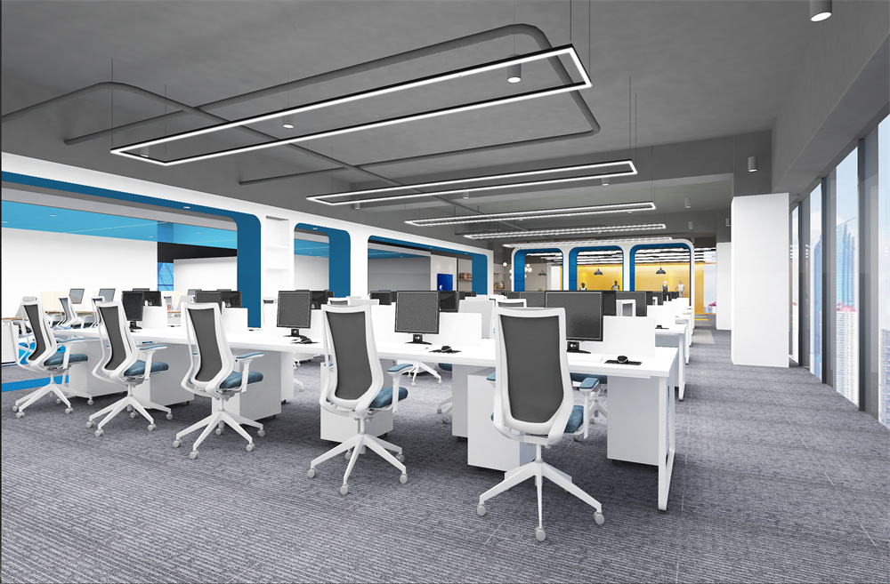 開方式辦公區(qū)員工常規(guī)比較密集,經(jīng)常有員工反映“燈下黑”的現(xiàn)象,所以在敞開辦公區(qū)燈光設(shè)計時建議選擇多方位,多角度燈光設(shè)計,提倡無主燈概念,區(qū)別于以往傳統(tǒng)只靠一盞主燈完成整個空間照明功能的一種設(shè)計方式,采用用不同燈具搭配,利用分區(qū)組合的方式完成空間照明功能的方式。避免了強光直射的不適感,視覺上更具美感,在空間劃分上,也起到一定視覺輔助作用。既解決了“燈下黑”的照明弊端,在視覺上又不會分隔空間,并不會因此顯得雜亂無章,給人以壓抑感。