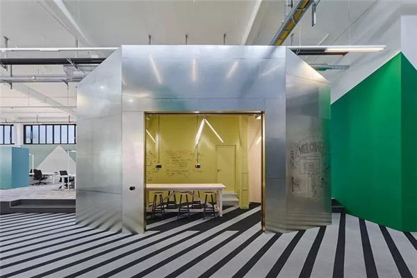 4、創(chuàng)意工業(yè)風(fēng)汽車公司辦公室裝修設(shè)計(jì):室內(nèi)材質(zhì)的選擇遵從于汽車產(chǎn)業(yè)的工業(yè)屬性。未加工鋅板、天然木材和鋼材表面共同構(gòu)筑室內(nèi)幾何單元。有著半通透質(zhì)感的聚碳酸酯材料板構(gòu)筑了室內(nèi)眾多隔間墻體。聚碳酸酯與原木框架的結(jié)合,讓這里呈現(xiàn)出建筑構(gòu)造較初始的發(fā)展?fàn)顟B(tài)中。初始化工業(yè)風(fēng)質(zhì)感在強(qiáng)烈的色彩映襯下和時(shí)尚的家具點(diǎn)綴下,形成鮮明的質(zhì)感對(duì)比,帶來(lái)豐富的空間體驗(yàn)。近似黑白對(duì)比的條紋地毯,在空間中不斷演繹著微妙的圖形變化,帶來(lái)精彩而時(shí)尚的視覺(jué)驚艷。